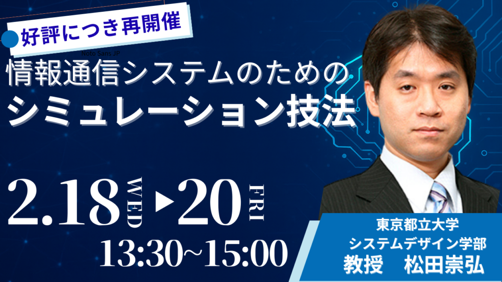 情報通信システムの設計や評価では、事前に有効性を確認し性能を左右する要因を分析することが欠かせません。その有力な方法として確率モデルに基づくシミュレーション実験が広く用いられています。本講座では、このシミュレーション技法を基礎から応用まで体系的に学びます。まず、シミュレーション実験の基礎となる確率モデルの考え方を理解し、次にシミュレーションの設計と実施方法を学びます。さらに、得られた実験結果を性能評価や指標分析にどう結びつけるかを具体的に解説します。加えて、無線通信や通信ネットワークなど代表的な情報通信システムを例にシミュレーションを実施し、理論と実践を結びつけます。本講座を通じて、情報通信システムにおけるシミュレーションの基本的知識と実践的な活用スキルを習得することを目指します。